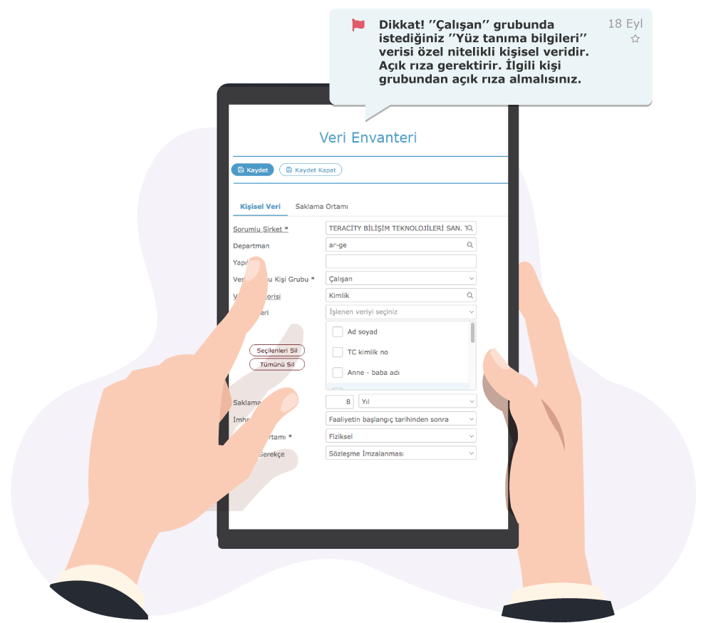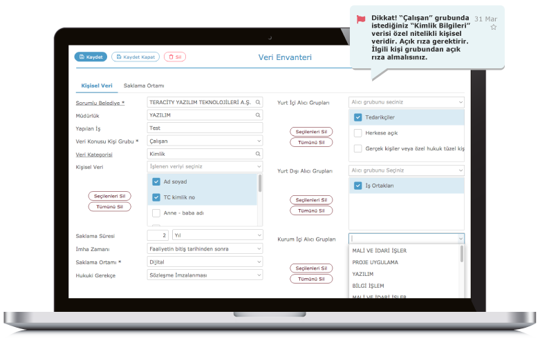 Bu menüde sayesinde ; Yapılan iş ve veriyi işleyen departman, İlgili Kişi grubu, Veri kategorisi, işlenen kişisel veri, Saklama ortamı, Saklama süresi , imha zamanı, İşleme amacı, hukuki gerekçe, alınan tedbirler, Yurt içi, yurtdışı aktarım ortamı verileri kolayca tanımlanır ve yönetilir.